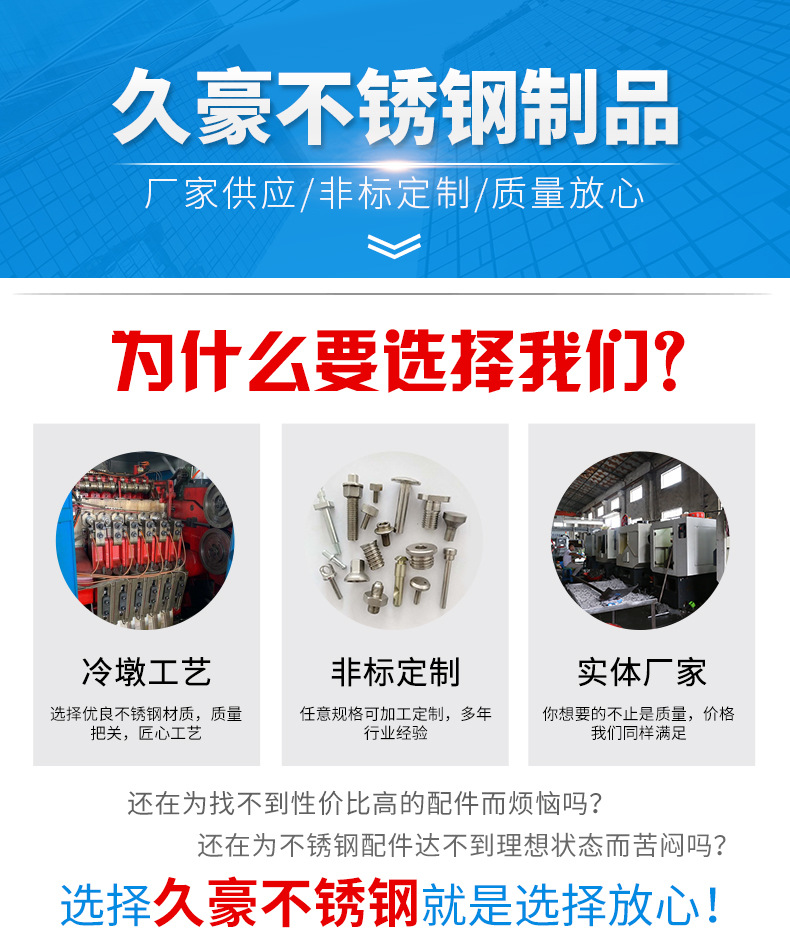 兴化市久豪不锈钢制品有限公司专业非标件开发加工,主营304、316等材料及一些特殊材料的轴肩螺丝,t型螺丝,台阶螺丝、防盗螺丝、马车螺丝、空心铆钉等,公司拥有完整、科学的质量管理体系。